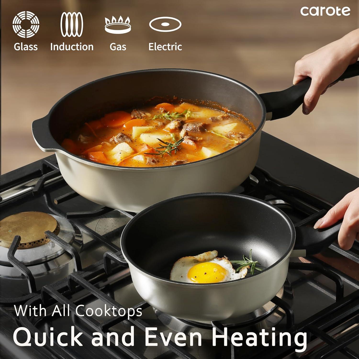 Versatile: Carote large frying pan with lid makes a great addition to your kitchen by serving multiple purposes in one, perfect for cooking larger portions of food, whether you're frying, stir-frying, or making stewed meals due to the depth of this skillet, keeping stuff from falling out while stirring, it also cuts down on splatter from grease or sauces you may be using.