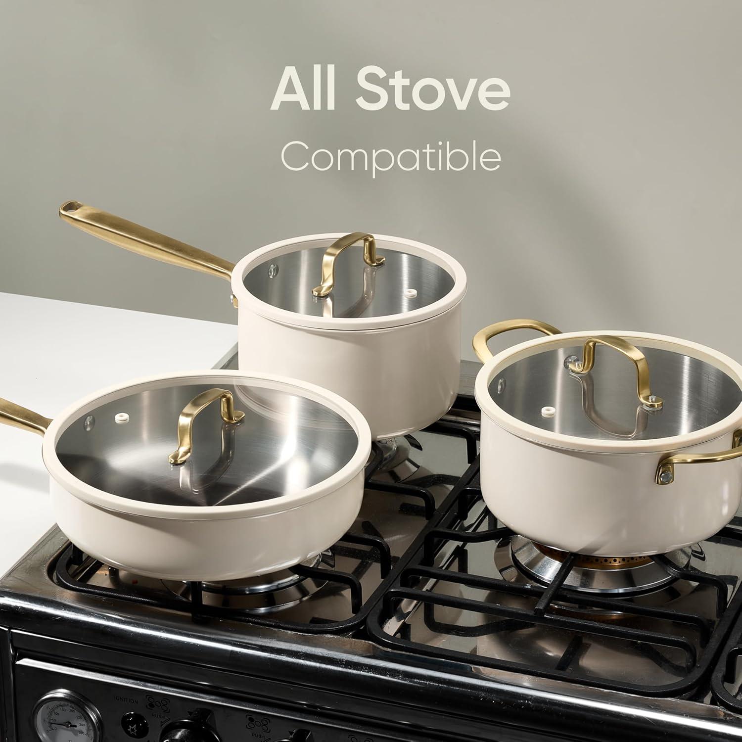 【High-quality materials】Magnetic pot bottom combined with a pure aluminum core ensures even heat distribution, allowing heat to penetrate evenly from the pot bottom to the sides for rapid and uniform heating. The creamy white ceramic outer layer has a premium feel.