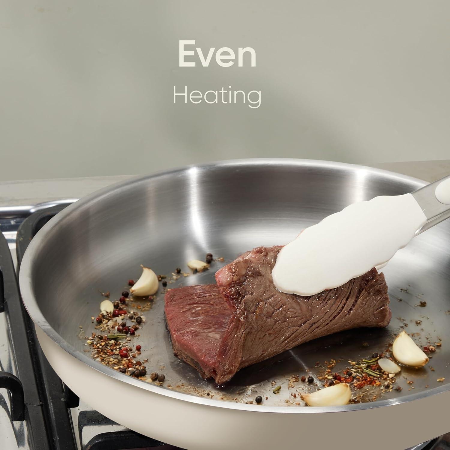 CAROTE 10″ Stainless Steel Frying Pan with Lid, Outer Ceramic Layer, Non-Toxic, Even Heating,Oven Safe, Induction, Ceramic and Gas Cooktops Compatible, White