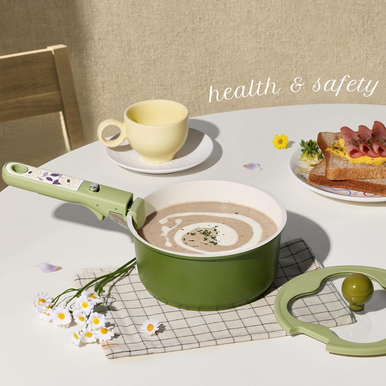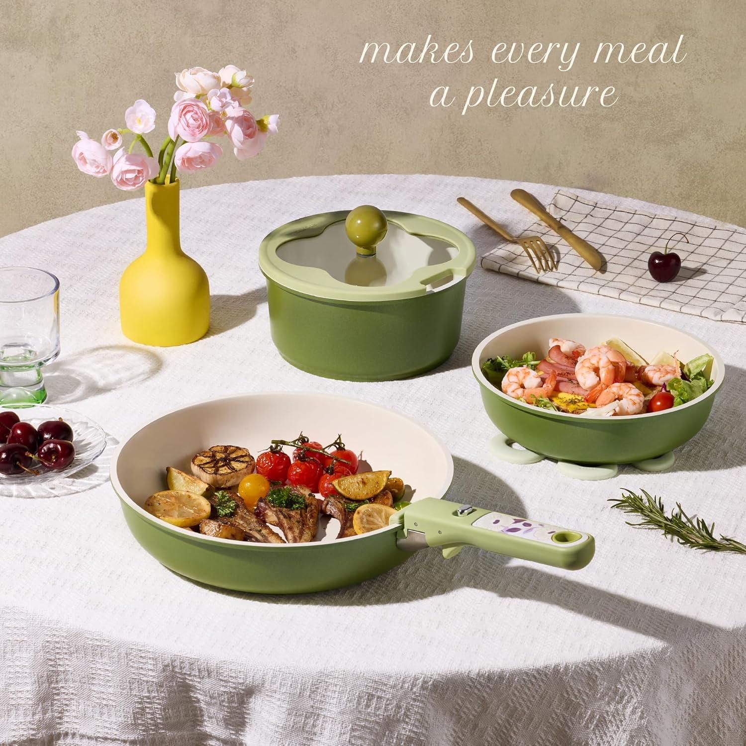 imageCAROTE 11pcs Ceramic Cookware Set Pots and Pans Set Non stick Induction Kitchen Cookware with Removable Handle RV Dishwasher  Oven Safe RVCamping Cookware PFOA Free PurpleGreen Flower