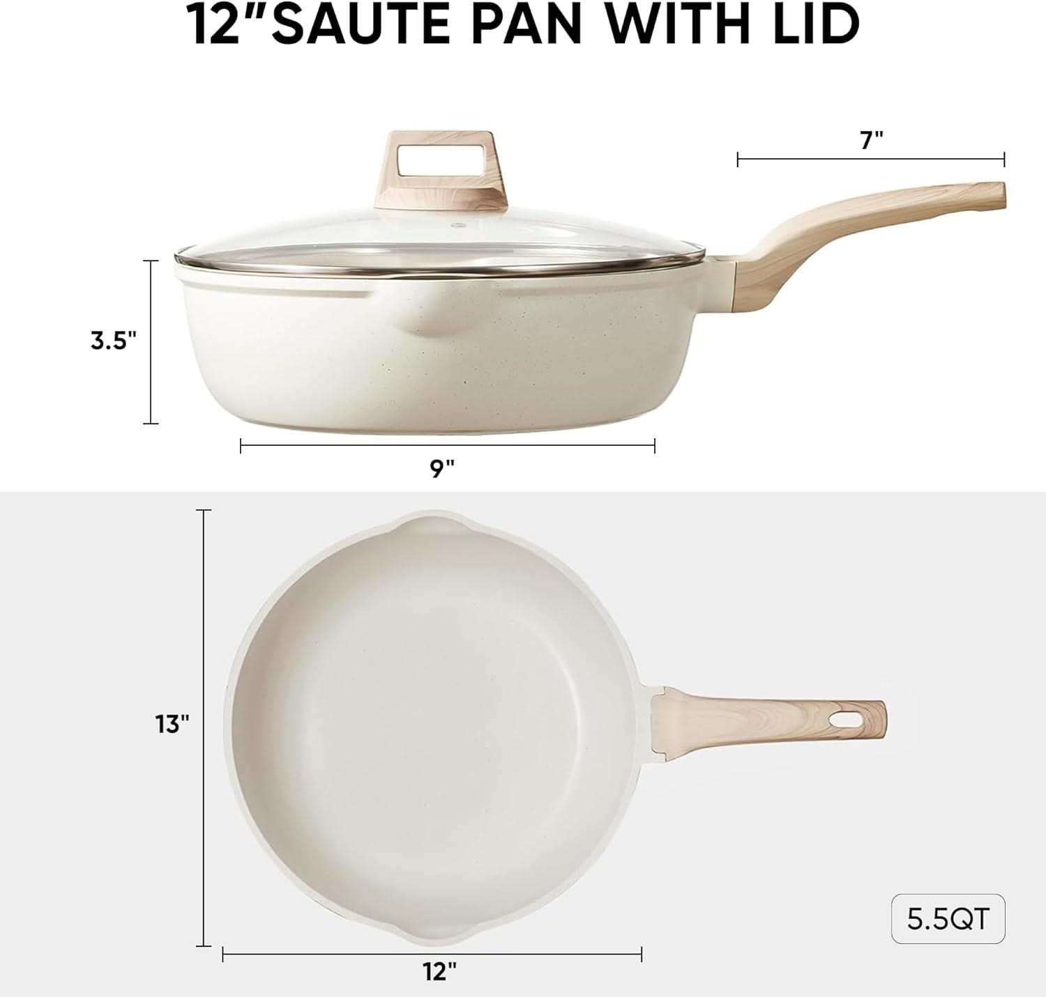 imageCAROTE 12Inch Nonstick Deep Frying Pan with Lid 55 Qt Jumbo Cooker Saute Pan with Pour Spout Skillet Induction Cookware Non Stick Cooking Pan Kitchen Pan PFOA Free White GraniteCream White