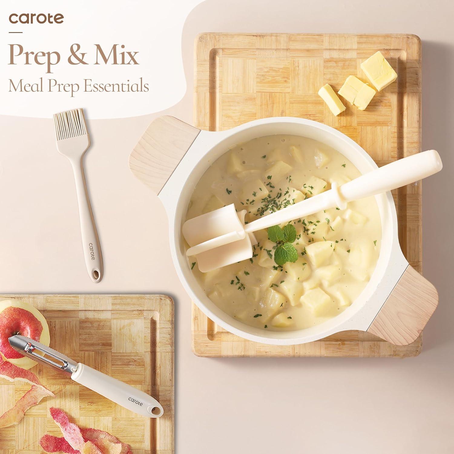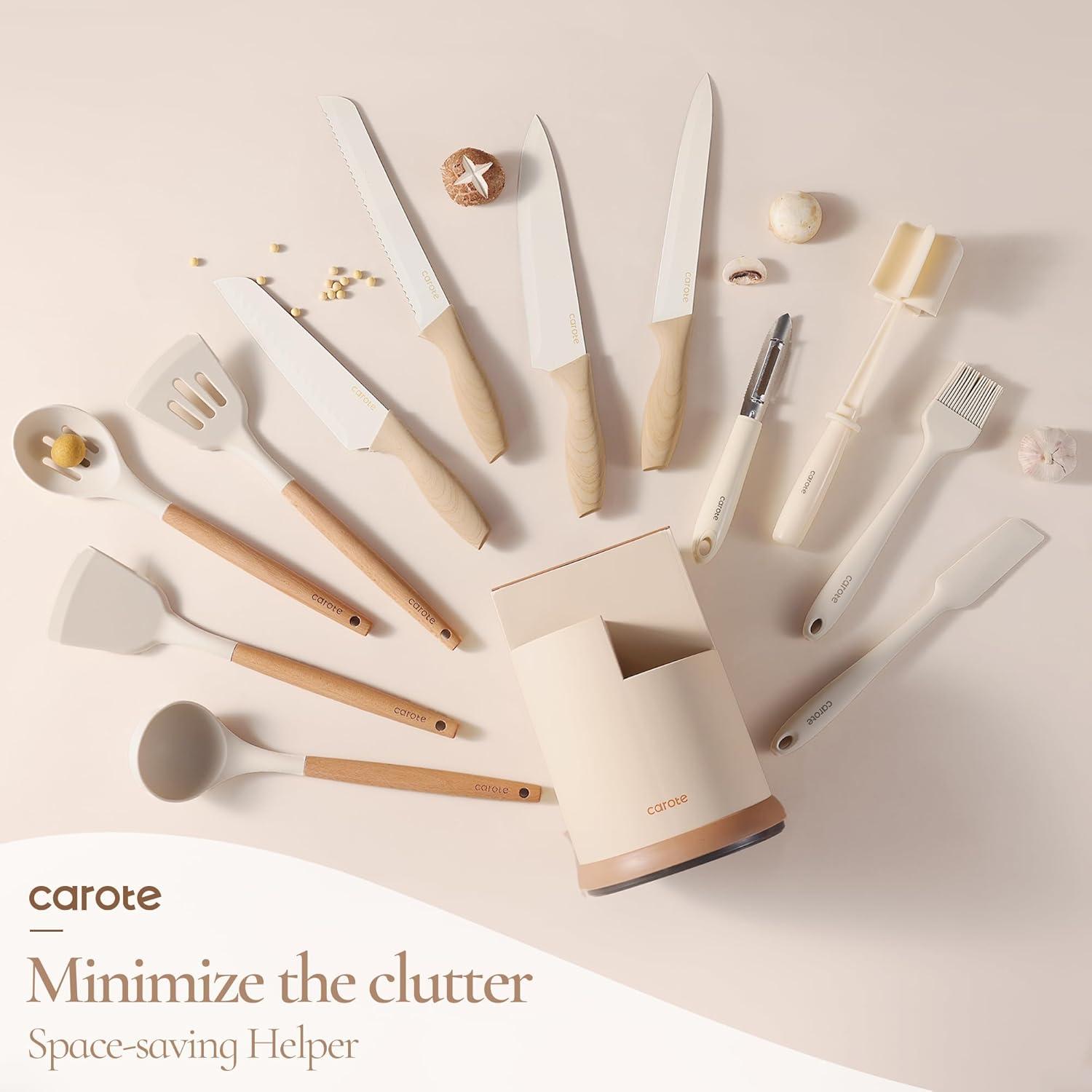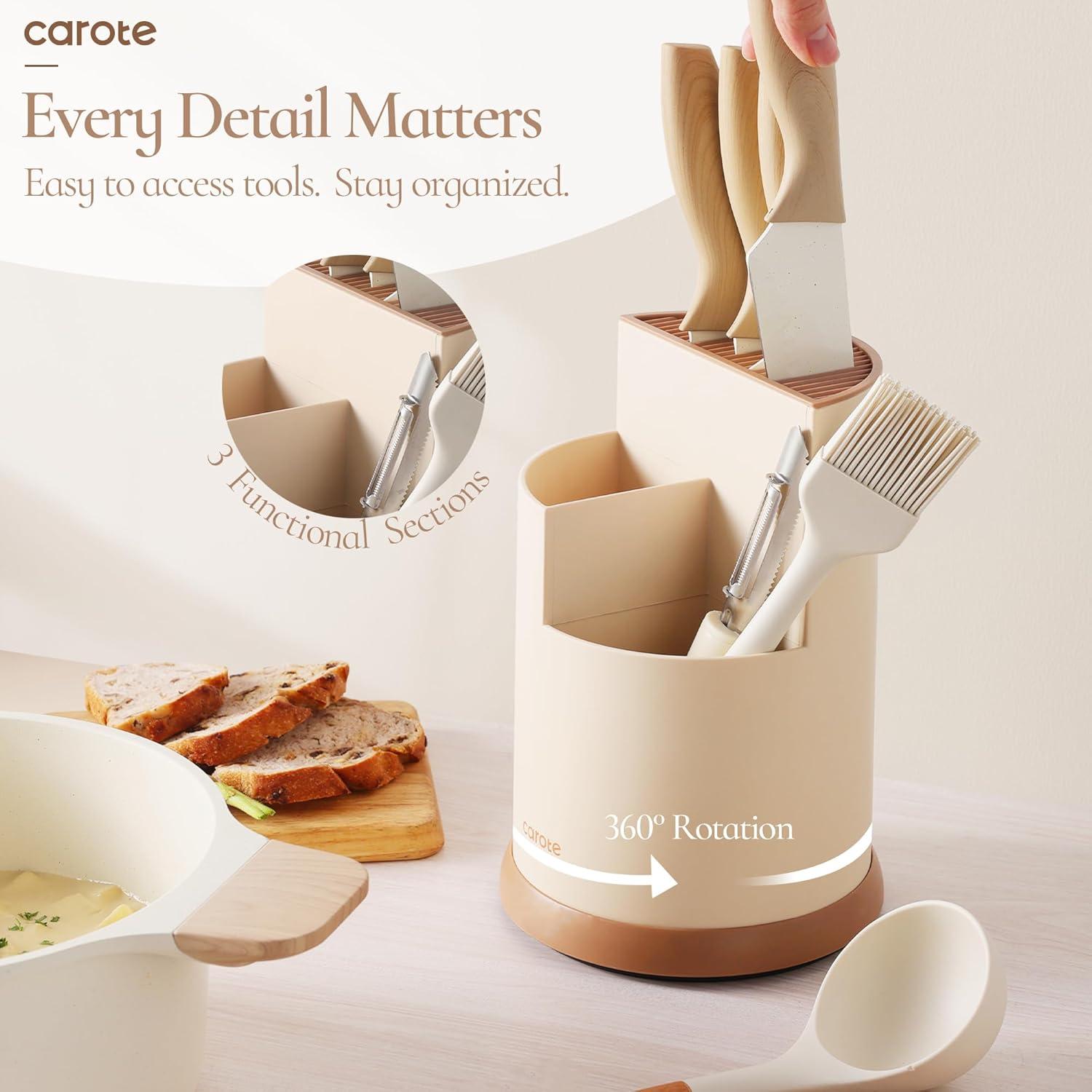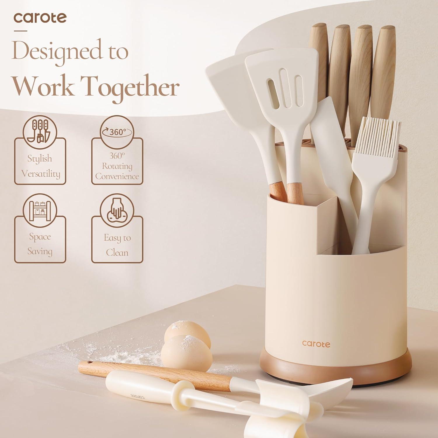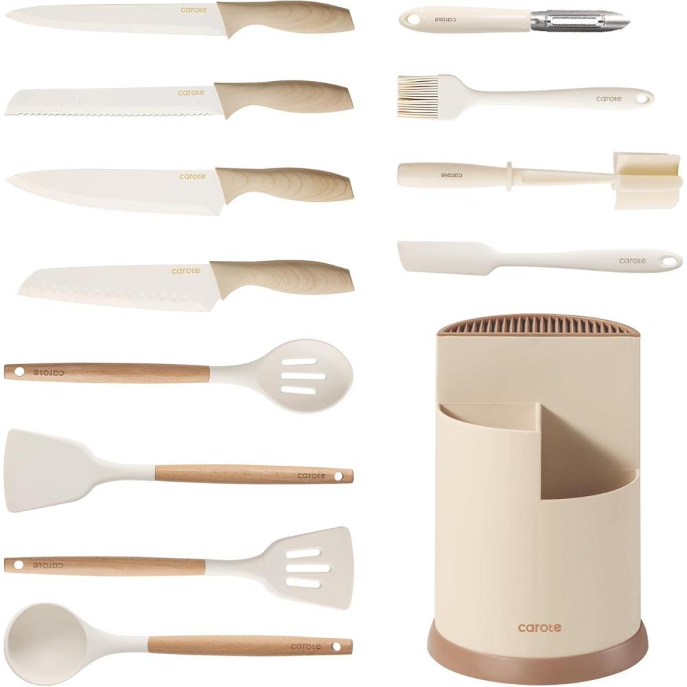 CAROTE 13Pcs Kitchen Utensills Set with 360° Rotating Knife Block, Heat Resistant Cooking Utensils Set with Wooden Handle, Kitchen Knife Sets with Nonstick Ceramic Surface, Cream White