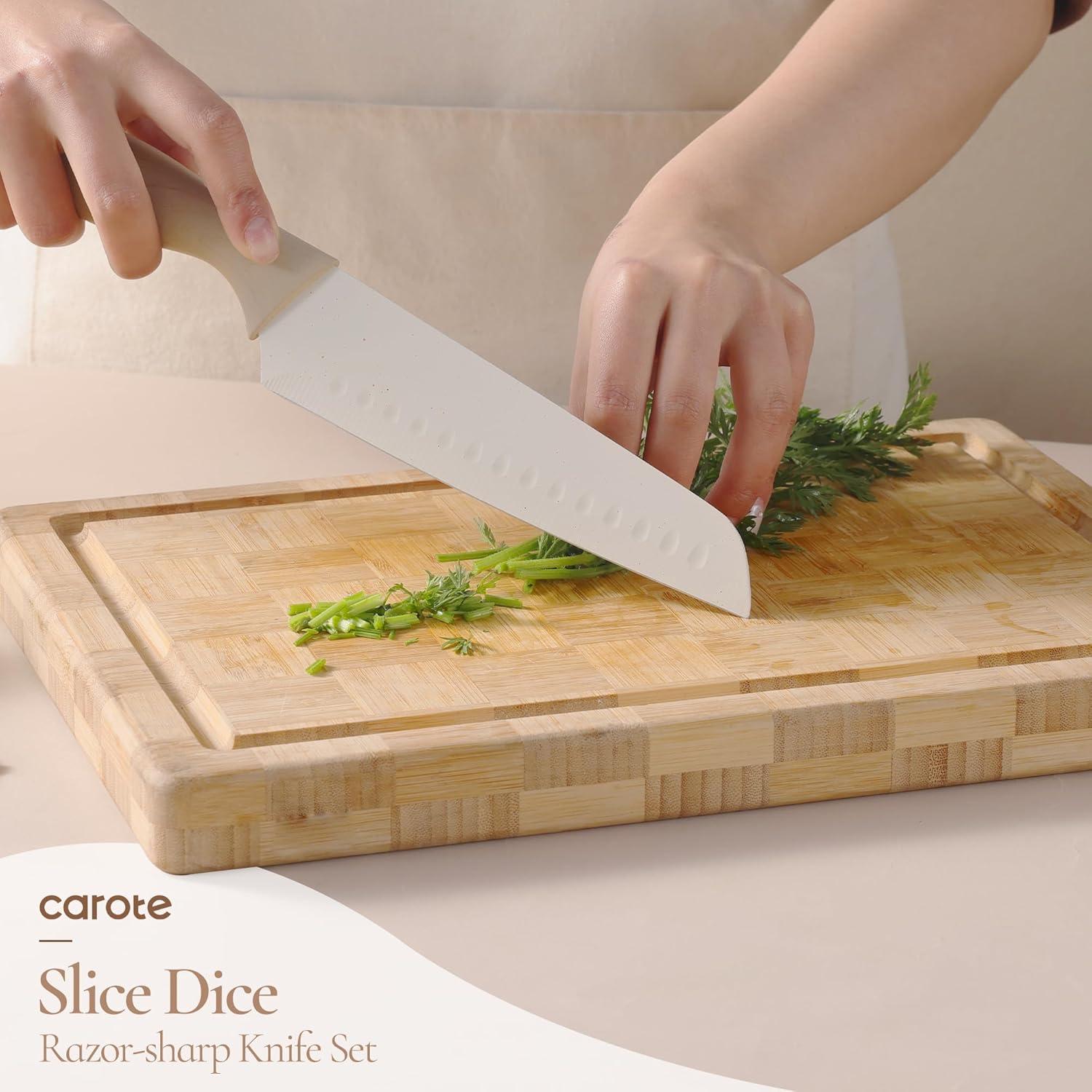 Durable Nonstick Surface for Easy Cleaning: CAROTE kitchen knife sets with block feature a nonstick ceramic surface, adding a sleek, modern touch while protecting the stainless steel blades from rust and corrosion. This coating enhances durability, prevents food from sticking, and makes both slicing and cleaning hassle-free—perfect for everyday cooking. Each blade is designed at the optimal cutting angle for effortless slicing and chopping.