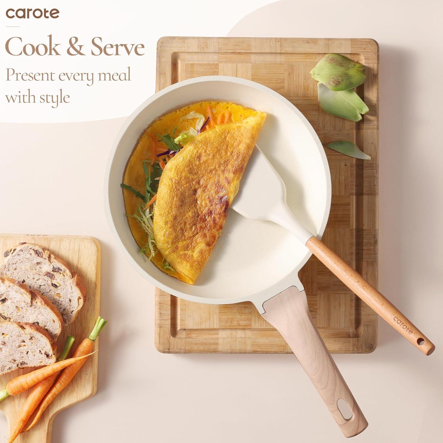 Non-Slip Handles for Secure Grip: CAROTE knife set with block comes with wood-grain textured handles, offering a comfortable and anti-slip grip for enhanced control and stability. Even with wet hands, you can safely handle your kitchen knives. The solid wood handles kitchen utensils remain cool to the touch, making cooking safer and more enjoyable.