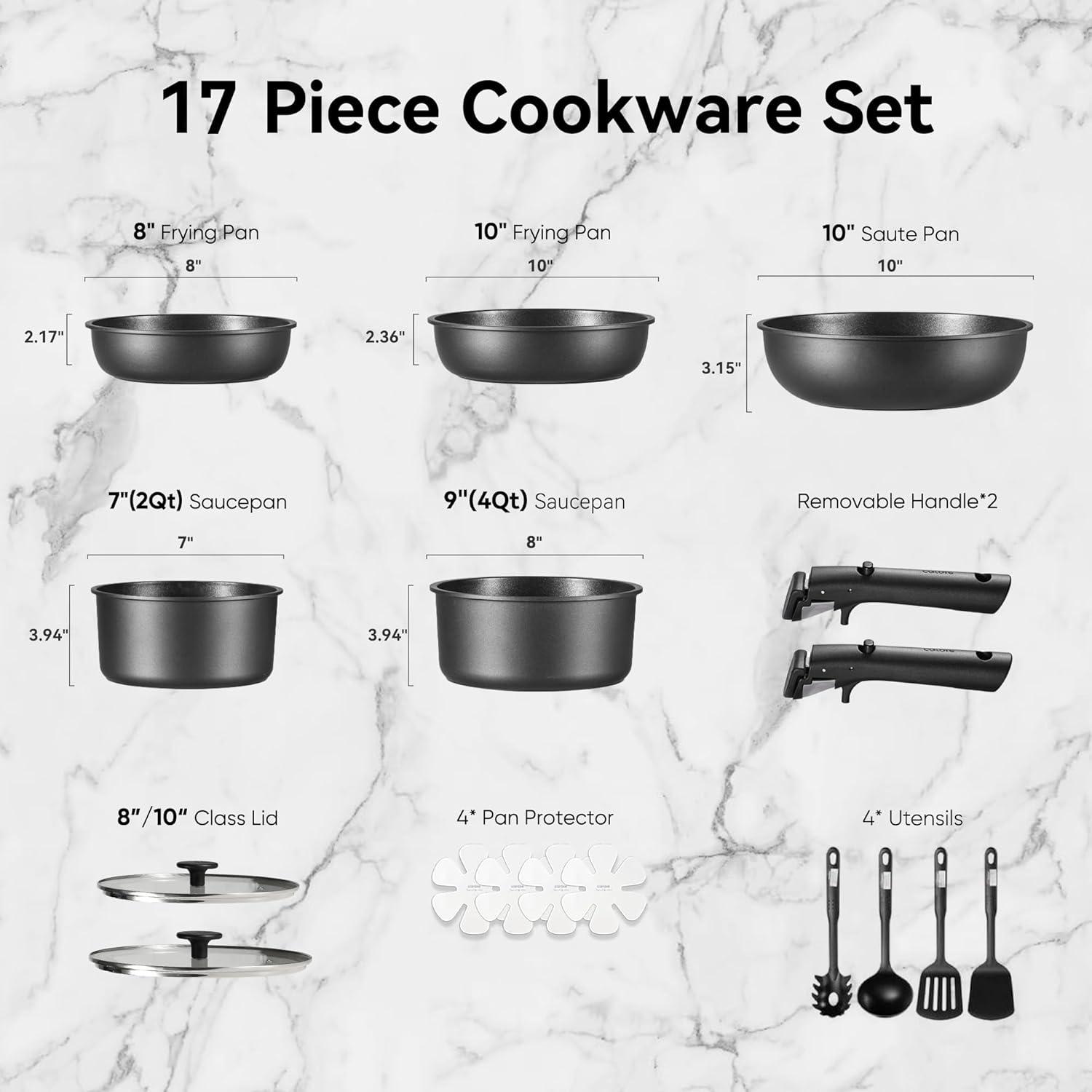 Set Includes:2-qt saucepan, 3-qt saucepan, 8'' frying pan, 10'' frying pan, 4-qt saute pan, 2*detachable handle, 4pcs utensils set, 4*pot protector.