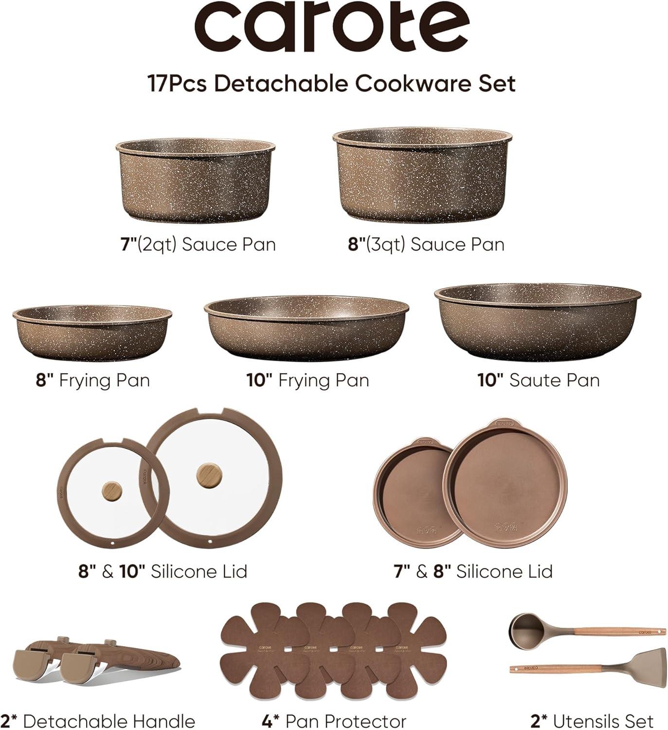 Set Includes: 2-qt saucepan, 3-qt saucepan, 8'' frying pan,10'' frying pan, 10'' Saute pan, 8''&10'' glass lids with silicone rim, 7''&8'' storage lid, spatula, spoon, 2*detachable handle, 4*pot protectors