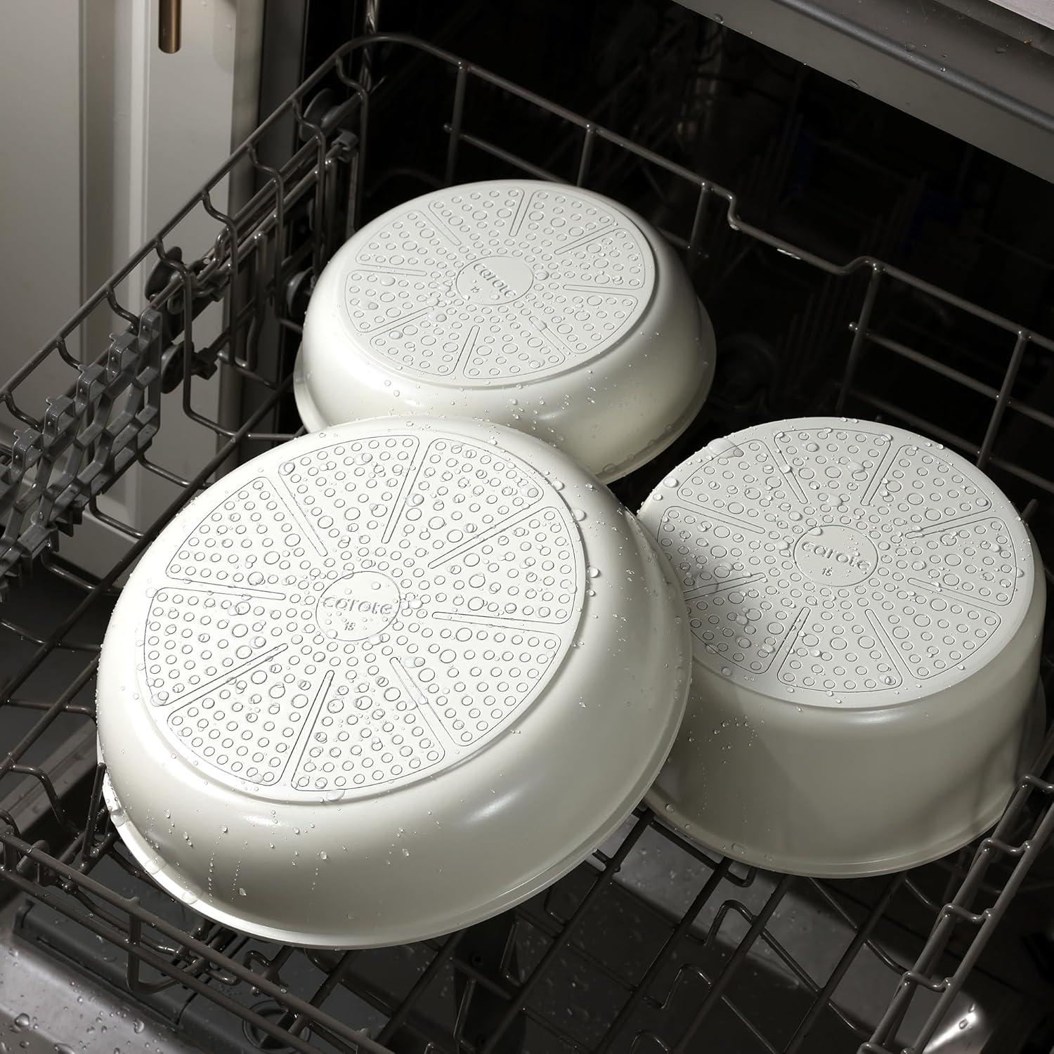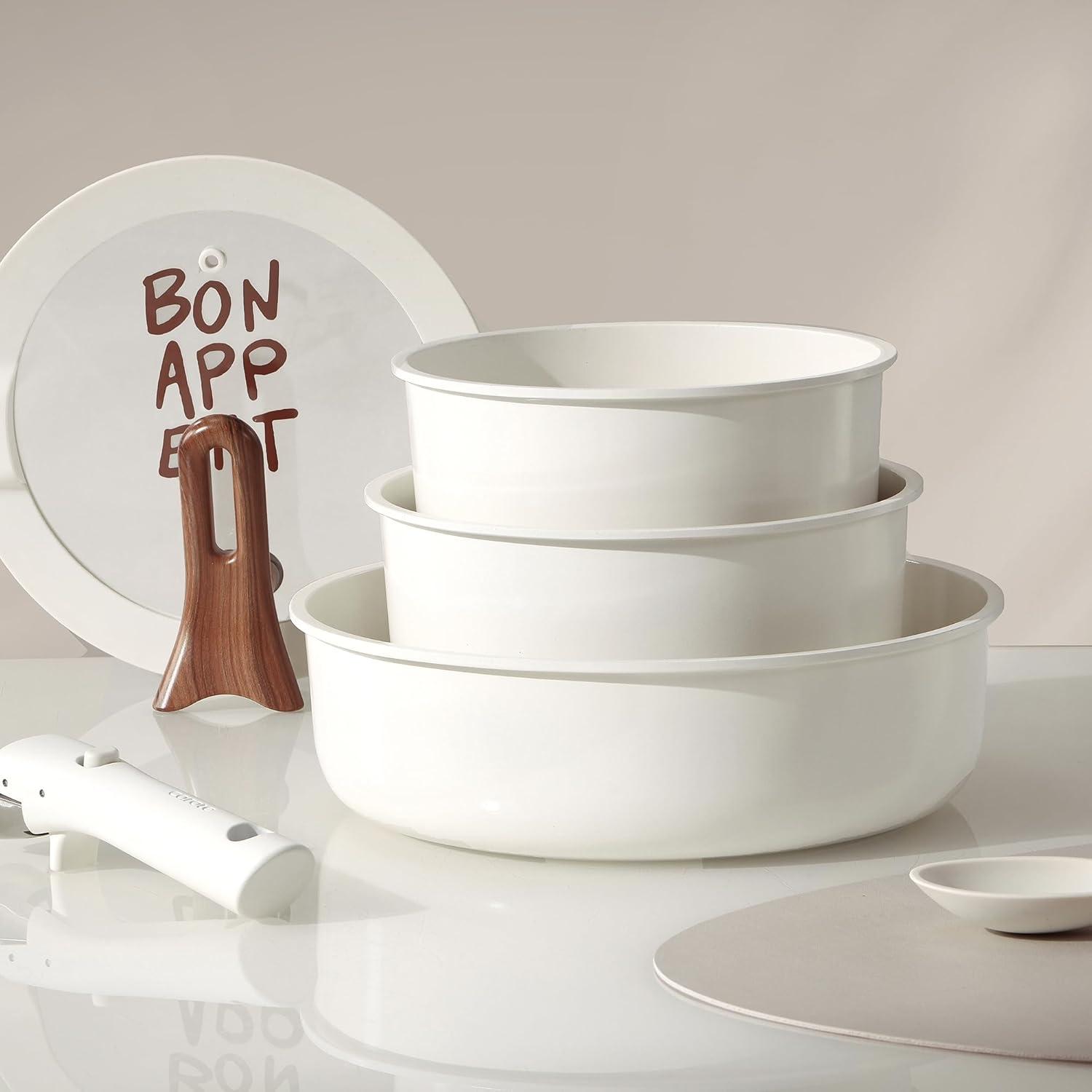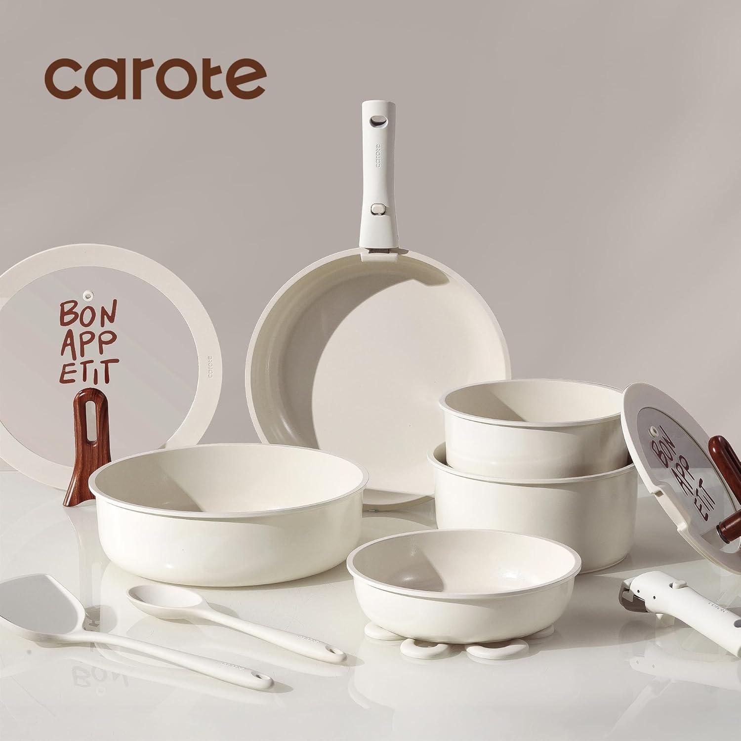 【Effortless Cleaning for Clutter-Free Cabinets】 Thanks to its non-stick properties, cleaning is a breeze. Serving as both cookware and tableware, Carote cookware set saves up to 70% space when handles are removed for optimal storage and easy stacking