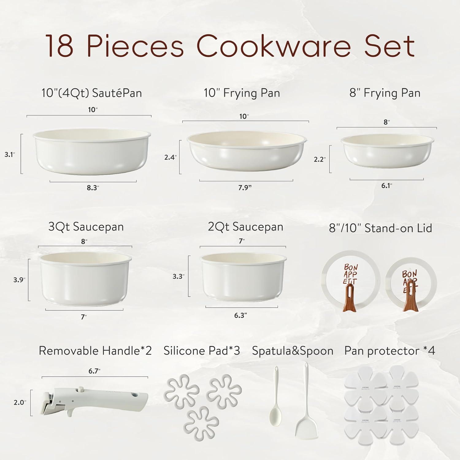【Set Includes】8'' frying pan, 10'' frying pan, 10'' sauté pan, 2-qt saucepan, 3-qt saucepan, 8''/10'' stand-on lid, 2*detachable handle, 1*silicone spatula, 1*soup spoon, 4*pot protector and 3*silicone pad
