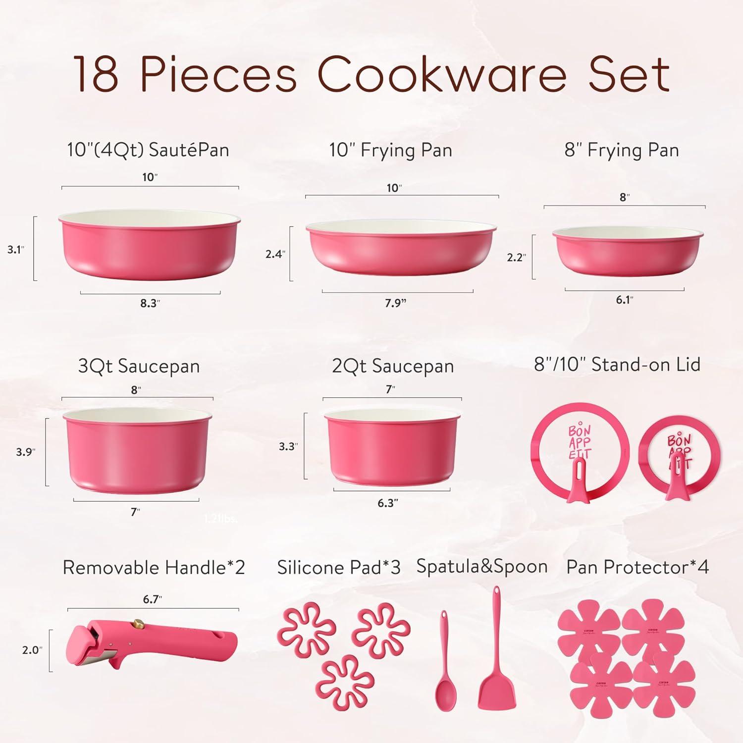 CAROTE 18Pcs Ceramic Cookware Set with Detachable Handle, Pots and Pans Set Non Stick, Non Toxic Kitchen Cooking Sets with Stand-Up Lid, PFAS and PFOA Free, Oven Safe, Induction Ready, Pink(Pink with stand-on lid)