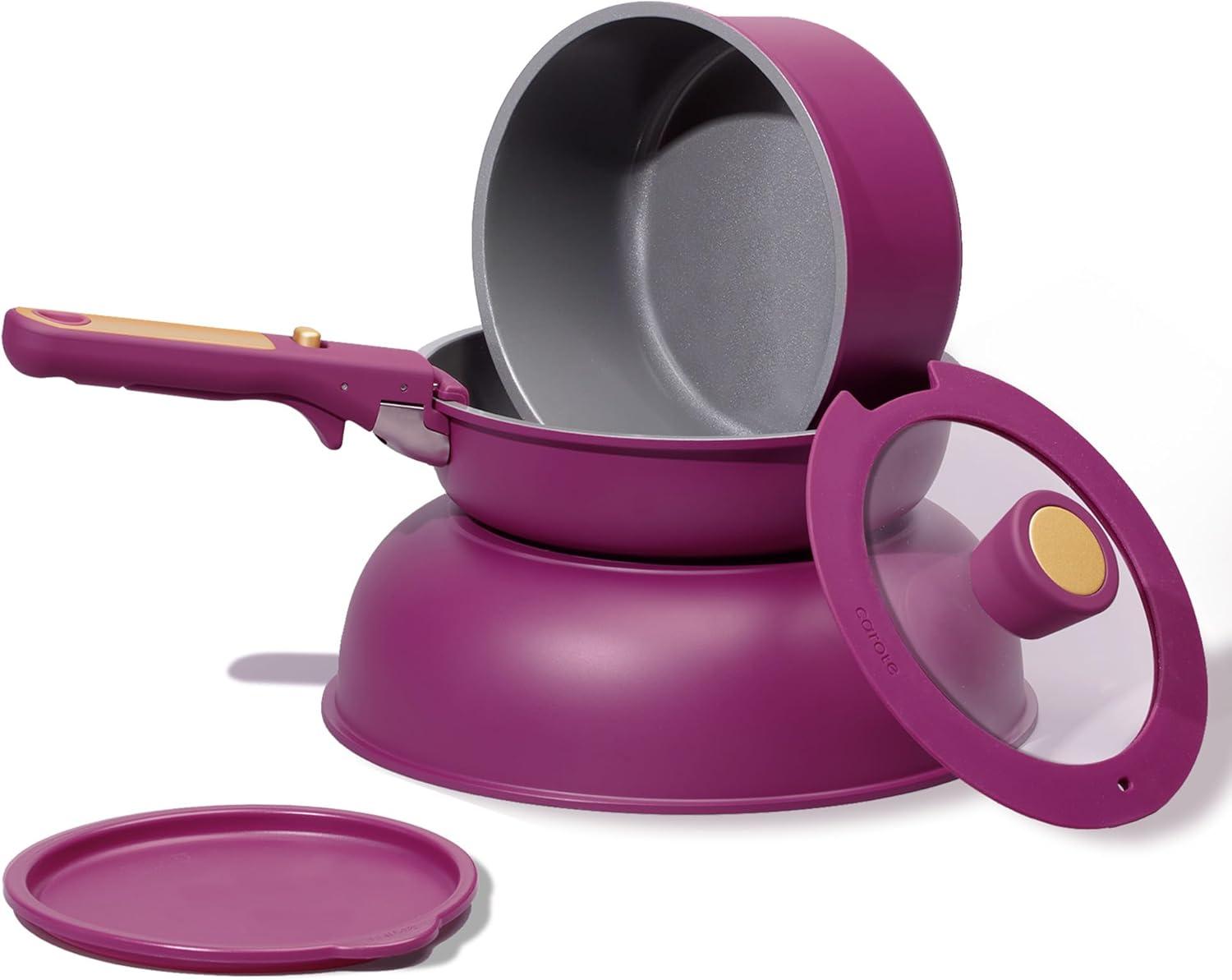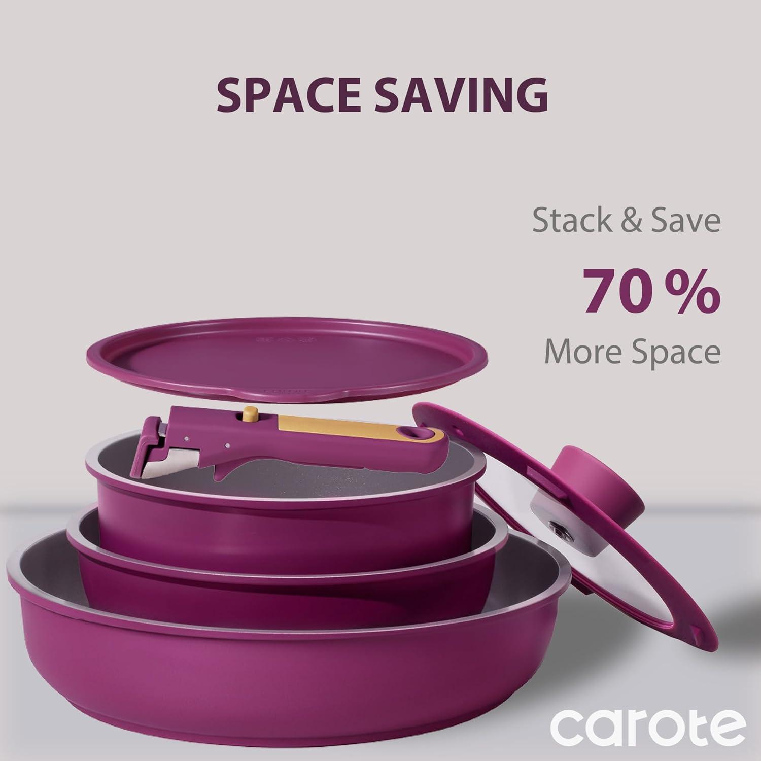 Optimal storage and easy stacking with the handles off saves up to 70% more space of Carote detachable handle pots and pans set