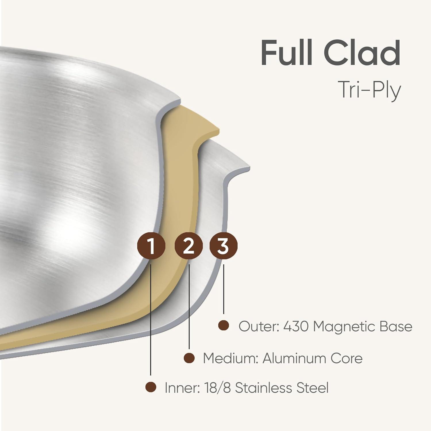 【Longer Lifespan】The fully clad, 3-layer metal construction ensures long-term durability and reliability while providing consistent, even heating—eliminating hot spots and delivering perfectly cooked results