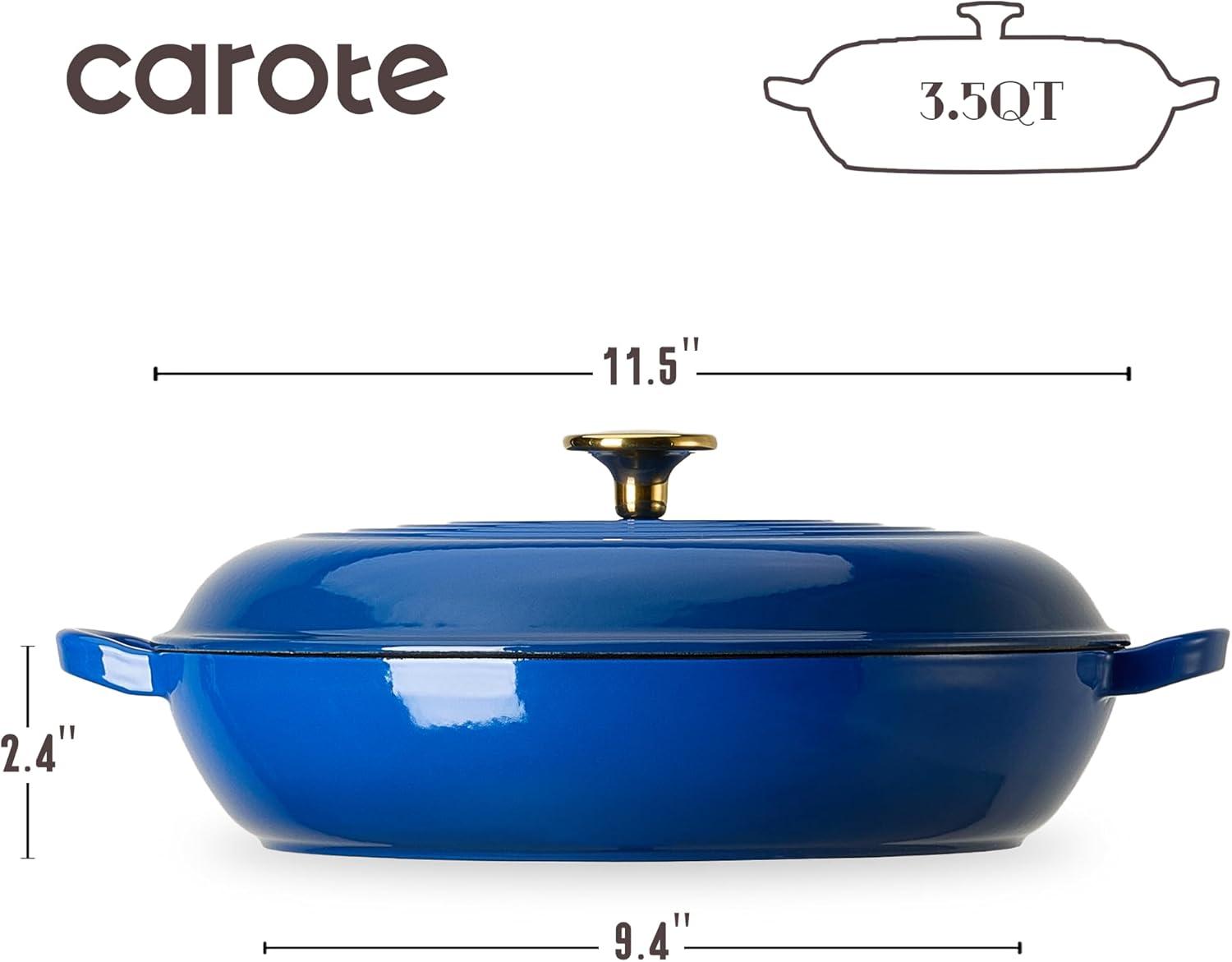 CAROTE 3.5QT Enameled Cast Iron Braiser Pan, Shallow Dutch Oven Casserole Skillets, Non-Toxic Cast Iron Pot with Lid for Grilling, Searing, Baking, Dual Handles, All Stovetop Compatible, Red(Blue)