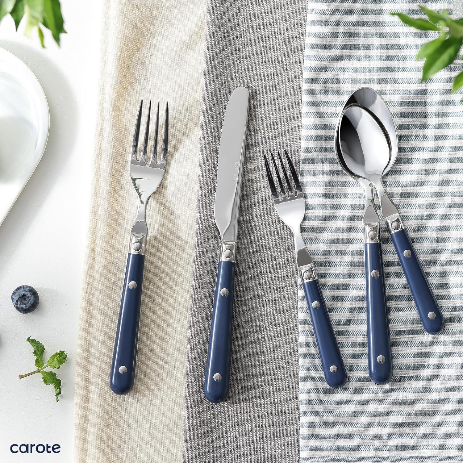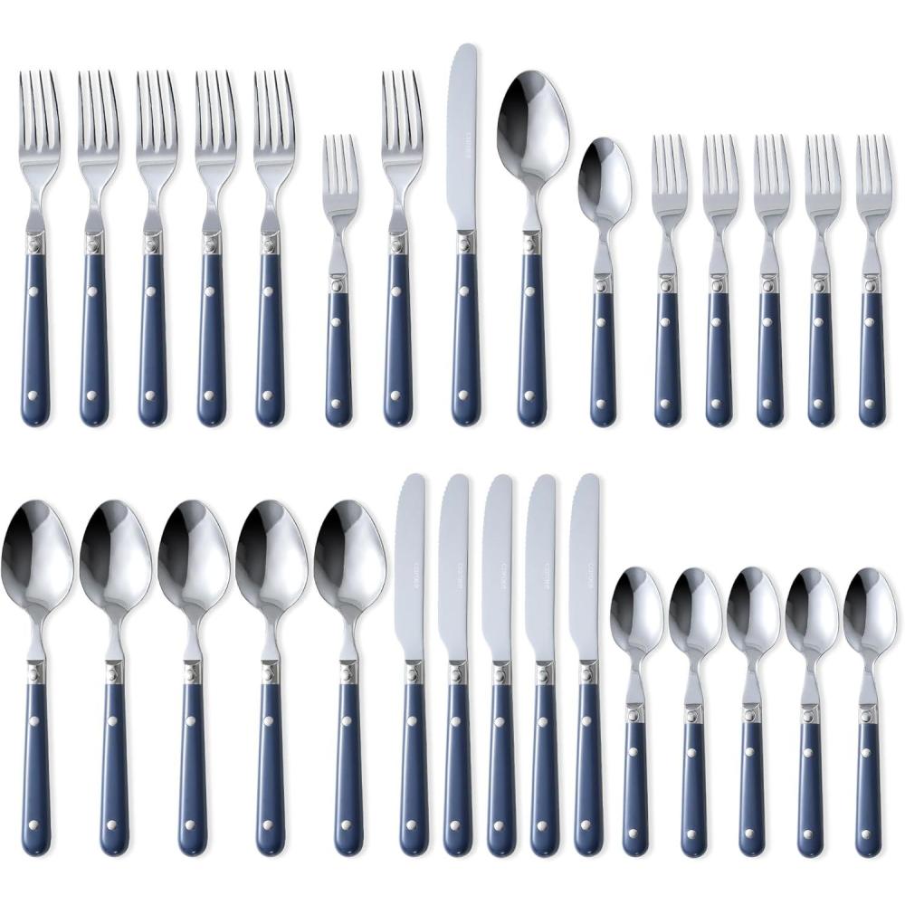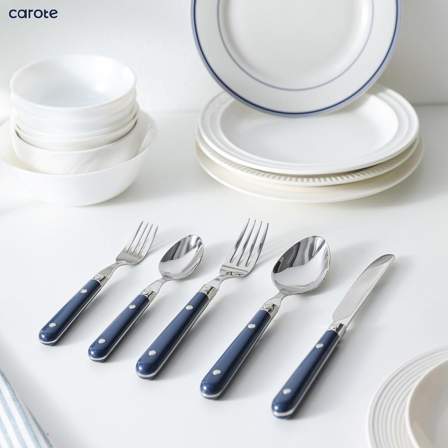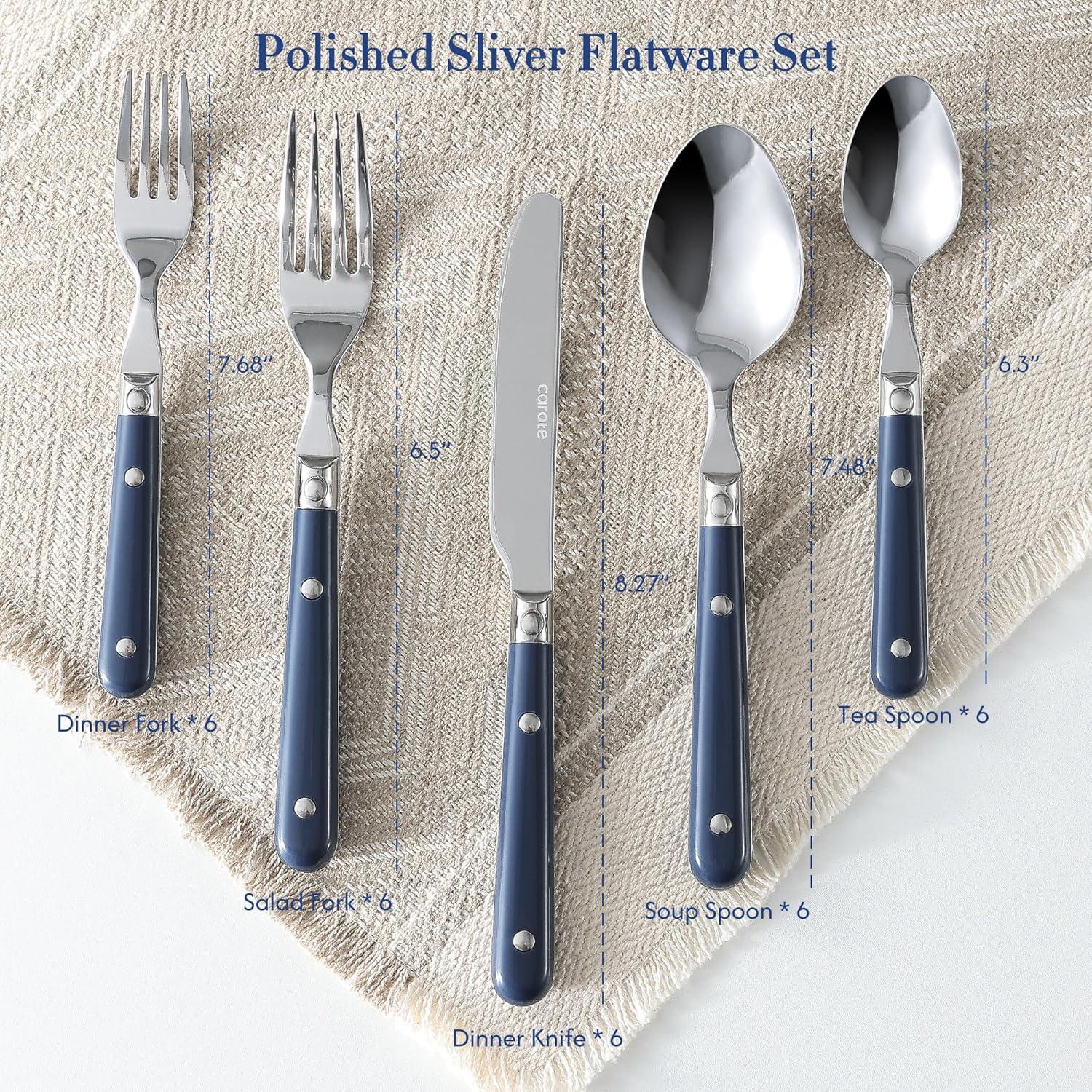 CAROTE 30-Piece Silver set, Stainless Steel Flatware Set with Blue Handles, Triple-Riveted & Full Tang Design, Kitchen Utensils Set, Mirror Polished, Durable, Blue