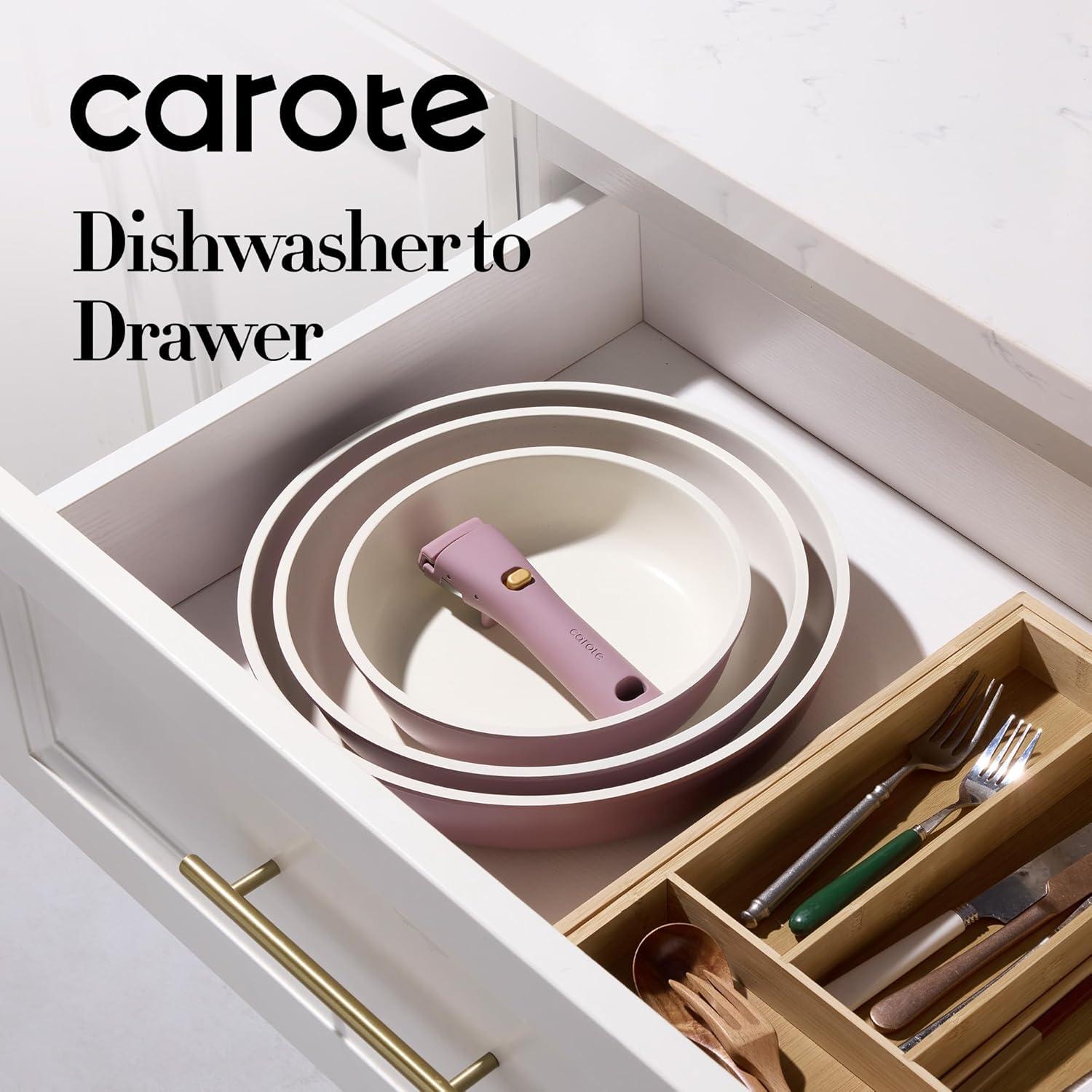 Optimal storage and easy stacking with the handles off saves up to 70% more space of Carote detachable handle pots and pans set, keeping your kitchen neat and organized.