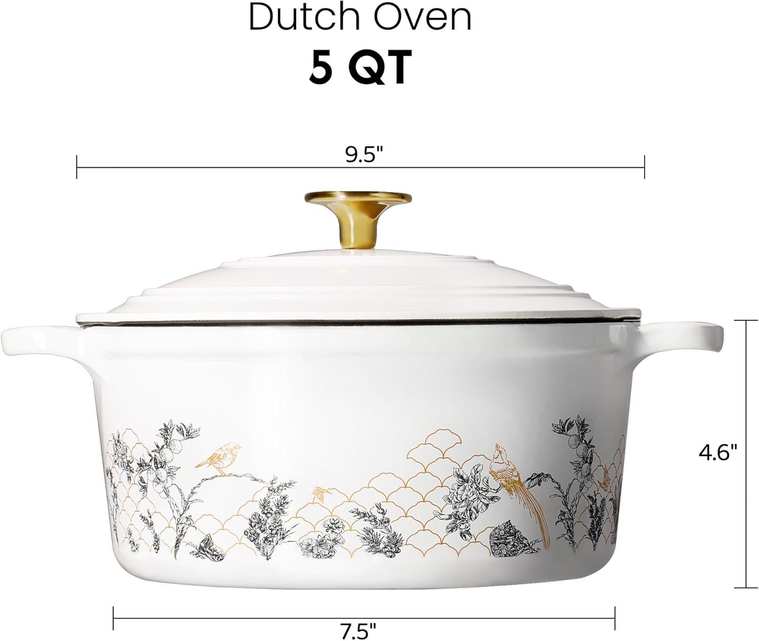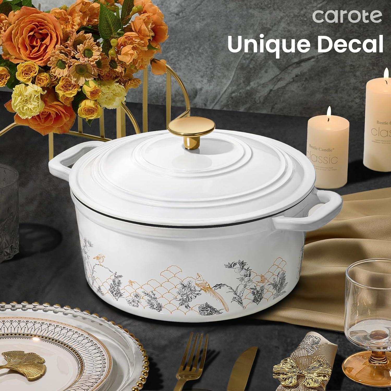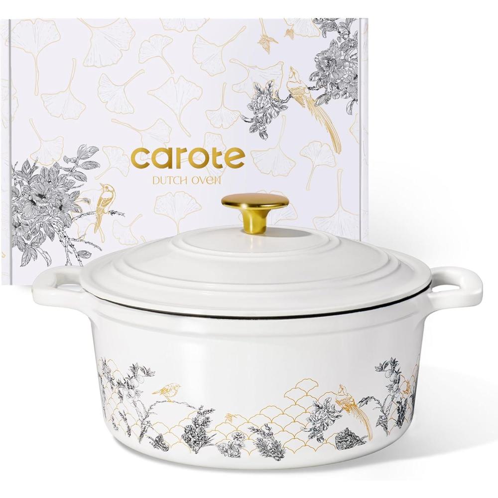 Innovative Design: Carote floral enameled cast iron dutch oven features a floral pattern on a traditional enamel dutch oven, making it both practical and collectible, adding a touch of color to your kitchen. The double-handled enamel dutch oven comes with a lid, and a matching floral gift box, making it the perfect gift for friends and family. You'll receive: an enameled dutch oven, a lid, and a gift box.