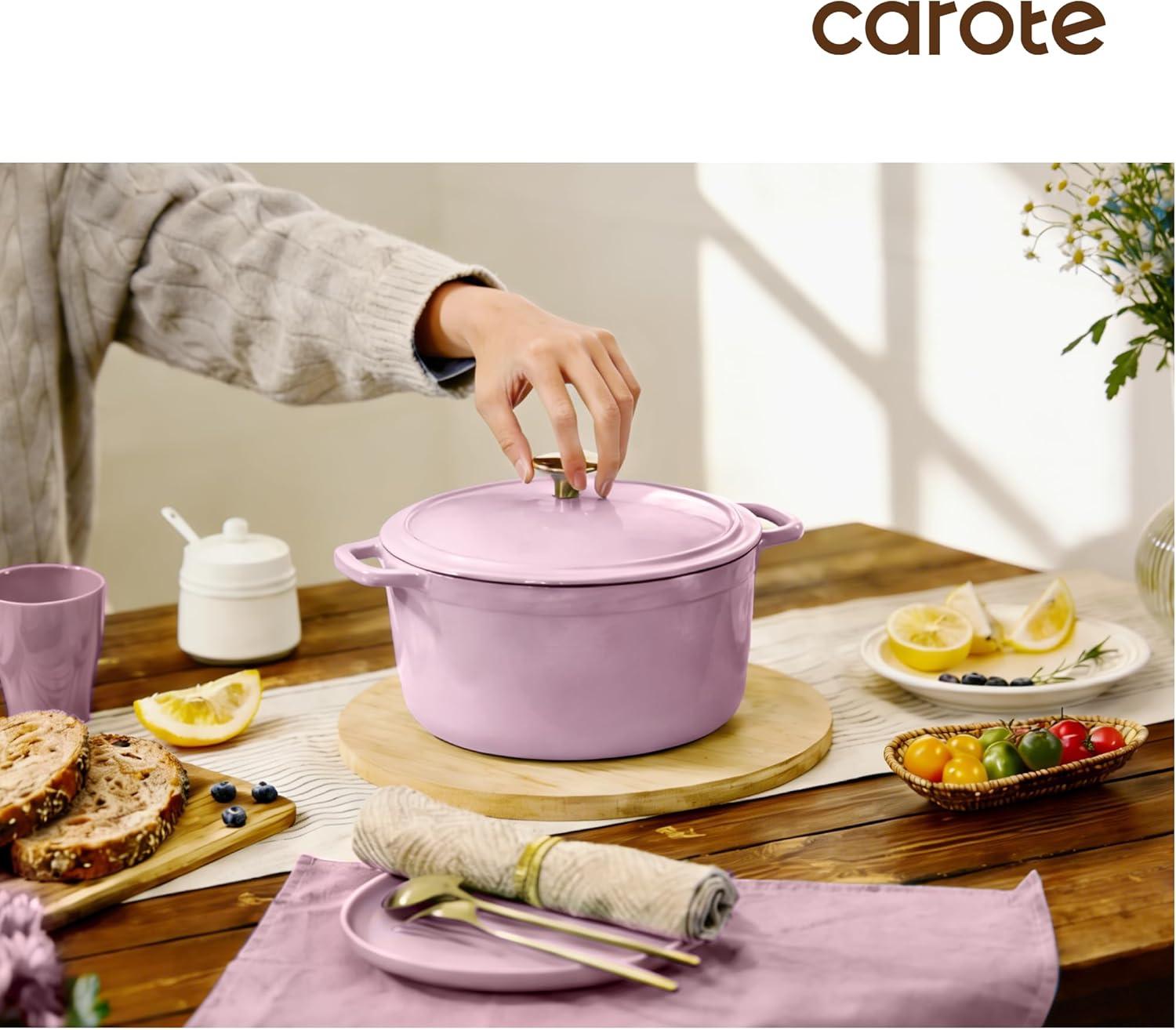 imageCAROTE 5QT Enameled Cast Iron Dutch Oven Pot with Lid HeavyDuty Dutch Ovens for Sourdough Bread Baking Braising Roasting Dual Handles Healthy ampamp NonToxic All Stovetop Compatible Oven Safe up to 500 F Macaron PinkMacaron Purple