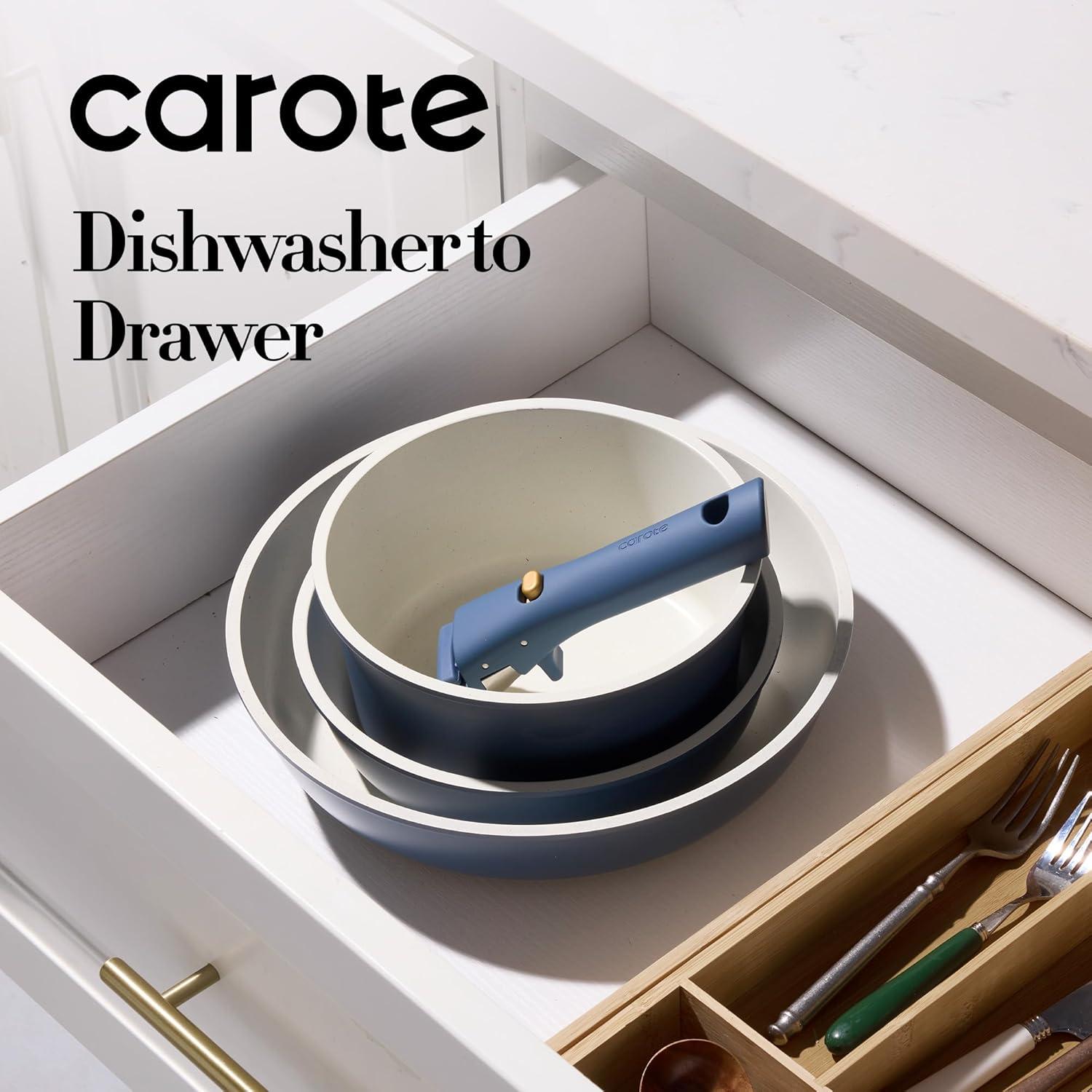 Optimal storage and easy stacking with the handles off saves up to 70% more space of Carote detachable handle pots and pans set.