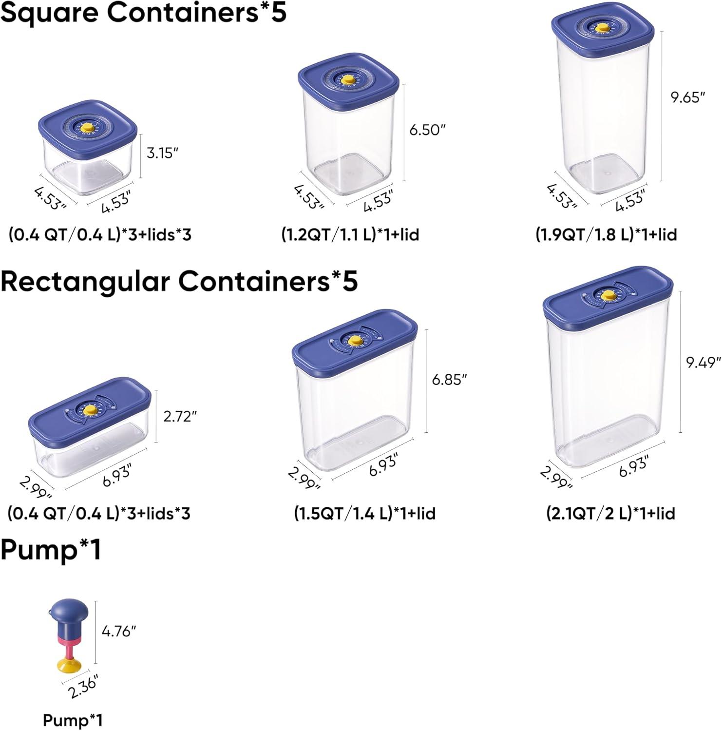 What's Included: 0.4QT square containers&lids*3 , 1.2 QT square containers&lids*1, 1.9 QT square containers&lids*1, 0.4QT rectangular containers&lids*3, 1.5 QT rectangular containers&lids*1, 2.1 QT rectangular containers&lids*1; Vacuum Pump*1