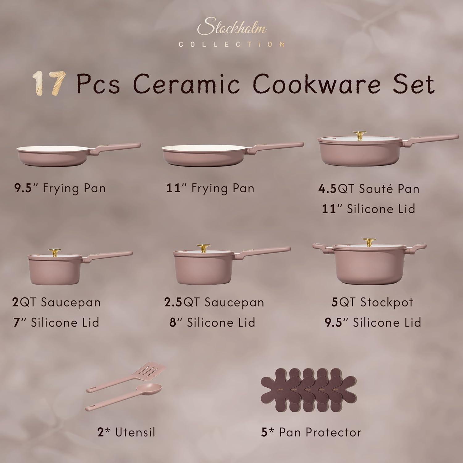 SET INCLUDES: 9.5 inch fry pan, 11 inch fry pan, 2 qt saucepan with lid, 3 qt saucepan with lid, 5 qt stockpot with lid, 3.5 qt sauté pan with lid, ladle, fish turner, spatula, 5*pan protectors.