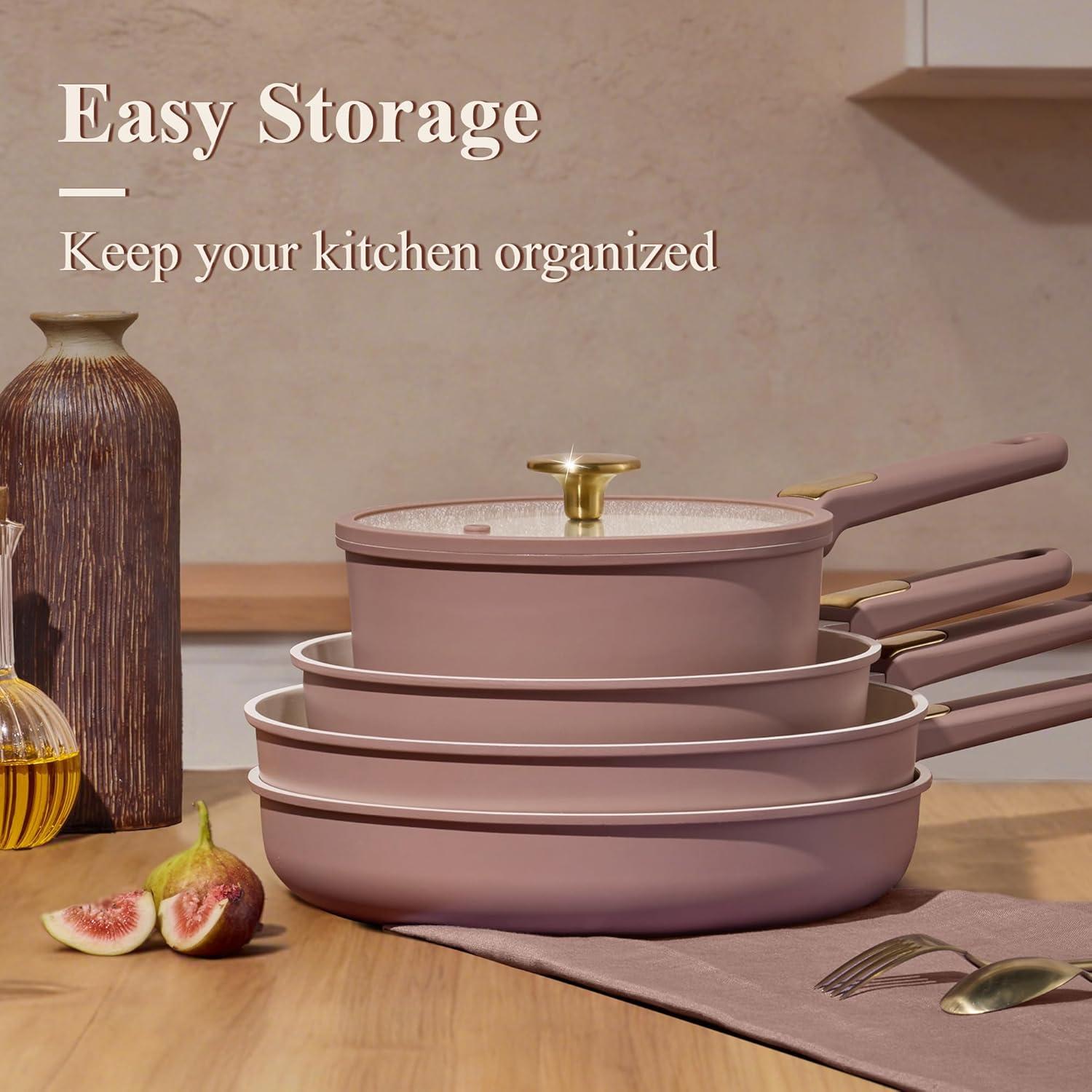 Easy Cleaning: carote pots and pans set non stick coating allows food to release easily, helping save cleaning time, water and effort. The cookware set makes cleanup a breeze.Simply wipe with a paper towel or rinse with water, hand washing is recommended as it cleans effortlessly.