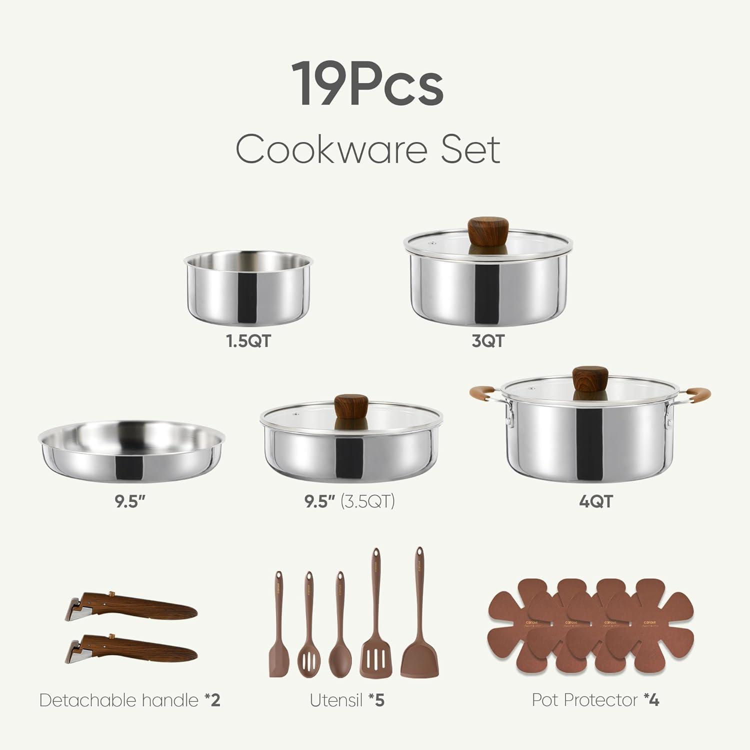imageCAROTE TriPly Stainless Steel Sauce Pan with Detachable Handle15QT Saucepan2QT ampamp 3QT Saucepan with Lid 8PCS NonToxic Induction Kitchen Stainless Steel PotRemovable HandleOven SafeWoodgrain19pcs