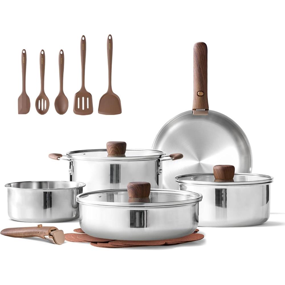 imageCAROTE TriPly Stainless Steel Sauce Pan with Detachable Handle15QT Saucepan2QT ampamp 3QT Saucepan with Lid 8PCS NonToxic Induction Kitchen Stainless Steel PotRemovable HandleOven SafeWoodgrain13pcs